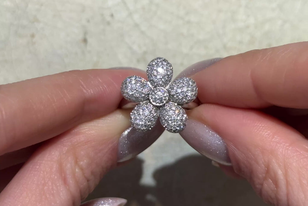 An 18 carat white gold flower ring pave set with 127 brilliant cut diamonds.