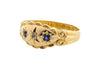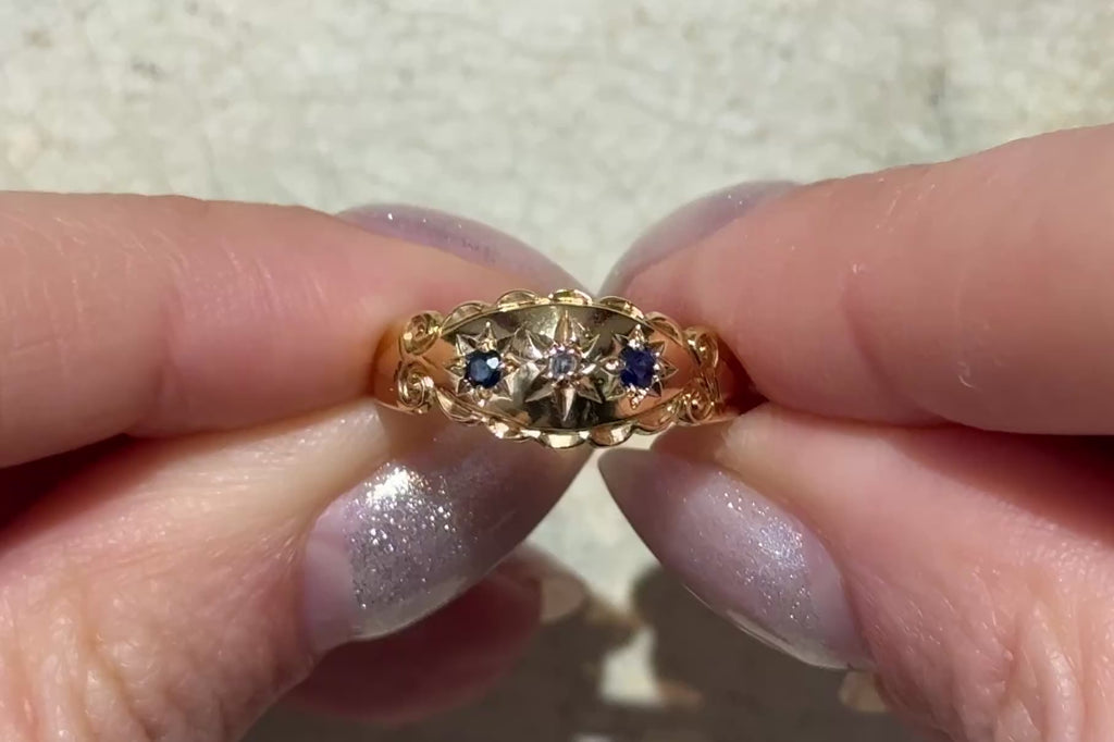 Een 18-karaats gouden ring in Edwardiaanse zigeunerstijl met twee saffieren en een roosdiamant in stervormige zettingen.De ring is voorzien van keurmerken van de stad Chester en het jaartal 1907.