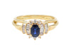 De saffier meet 6 mm x 4 mm en heeft een gewicht van circa 0,60 karaat. De diamanten hebben een totaal gewicht van 0,56 karaat, een VS tot SI1 kwaliteit en een H kleur. De ring weegt 5,3 gram.