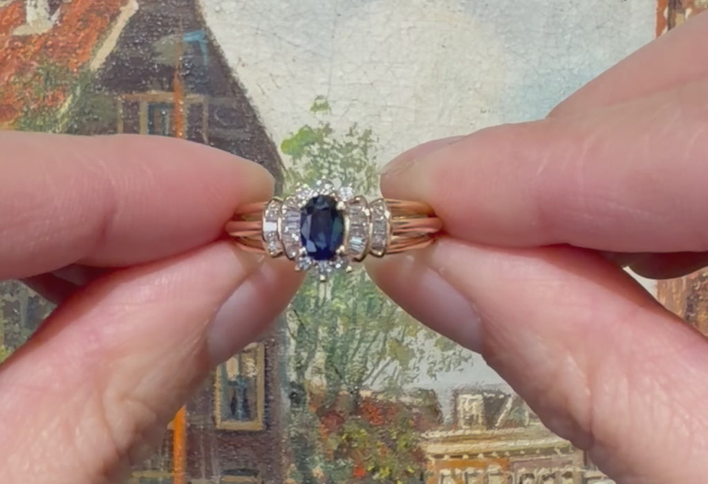 Een 14-karaats gouden ring met een ovale, gefacetteerde blauwe saffier in een trapsgewijze zetting van zes briljantgeslepen diamanten en twintig baguettegeslepen diamanten.
