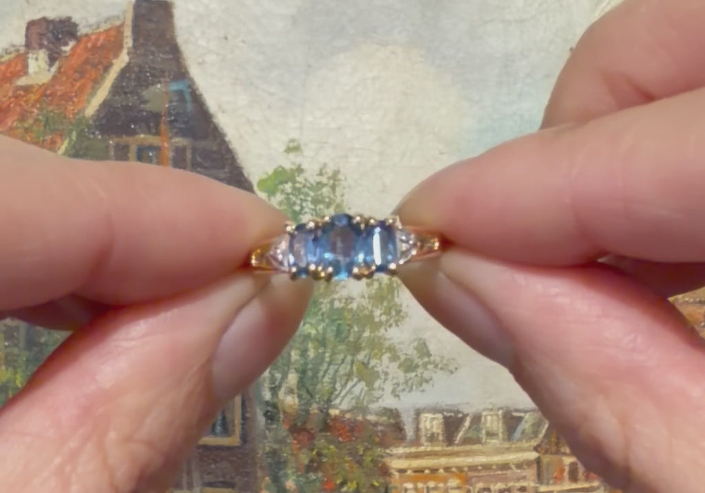 De middelste saffier meet 6 mm x 4 mm en er is in totaal ongeveer 1,30 karaat aan saffieren.