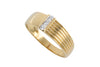 An 18 carat gold ring with three brilliant cut diamonds in a channel setting. The band on one side of the diamonds has a polished smooth surface, the other side is designed with a six piece groove pattern.