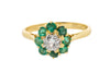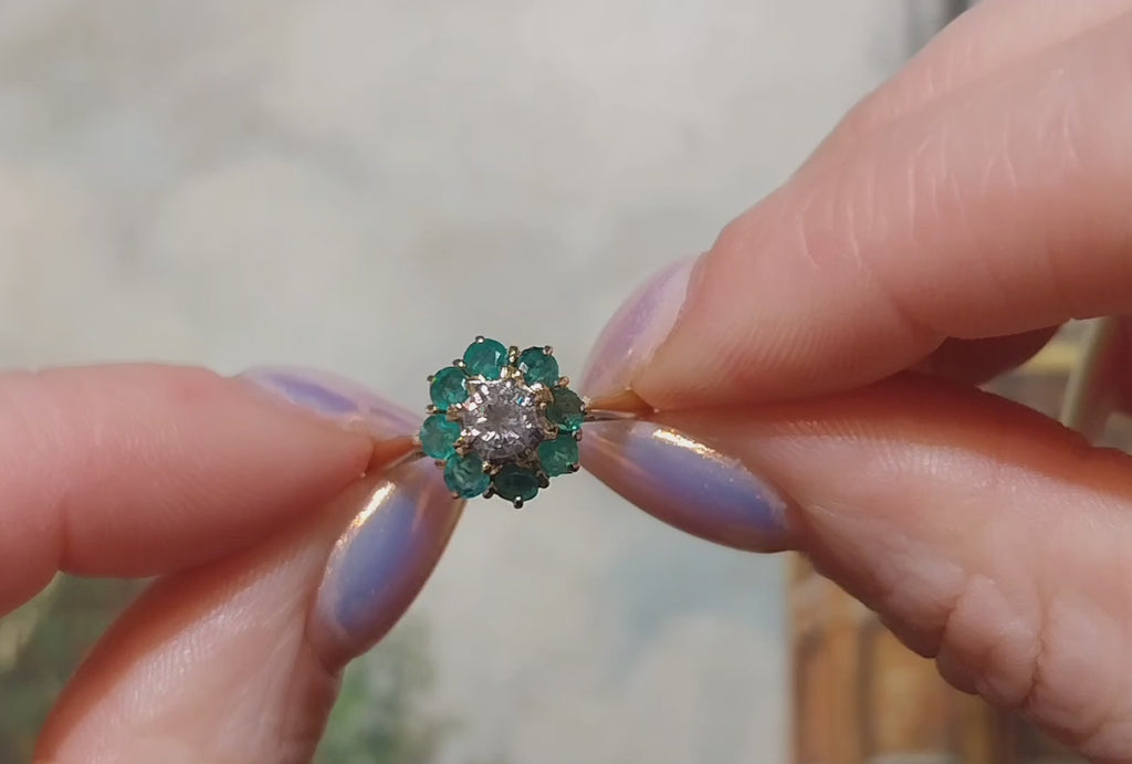 The diamond is a .20 carat stone, VS in quality and H in color. The eight emeralds have a diamter of 2 mm and are around .32 carat in total. The setting has a diameter of 10.5 mm.